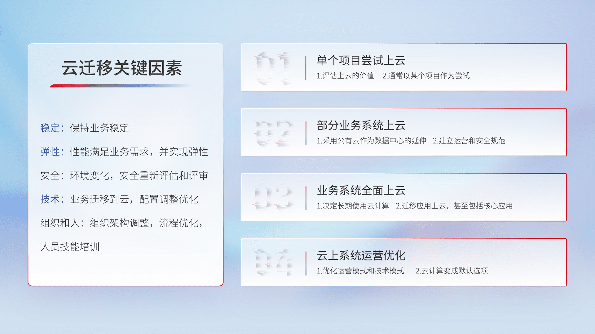 结合实际业务,,,从规划设计、、、云平台选型、、云原生改造、、、数据迁移、、、、集成交付,,,迁移全过程为客户识别最佳上云路径,,,做好风险识别管理,,设计网络架构、、、、身份权限、、、安全审计合规、、操作审计、、、日志审计、、、、监控告警策略、、、多站点容灾设计等,,,,对云上基础设施进行整体规划,,,,提升IT治理水平,,,以满足弹性、、、、高可用、、高性能的需求。。