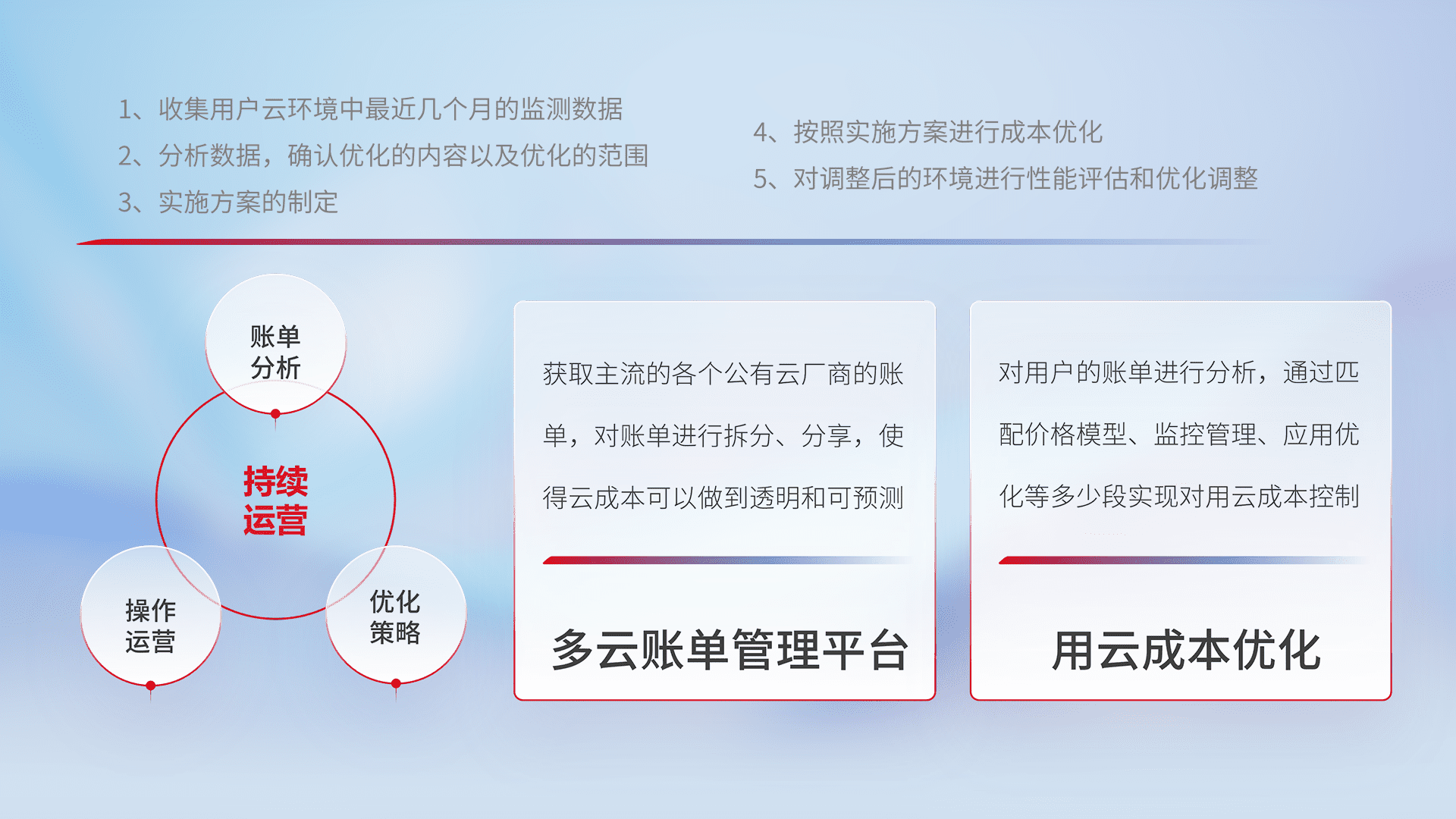 通过多云纳管,,,,以统一的资源数据模型把客户的云资源进行抽象和封装,,,,进而实现对多云资源的统一操作,,,保障云资源管理的可靠性、、、稳定性与可用性。。。量身定制化运维内容,,,,配置、、开发运维、、补丁管理、、、备份、、监控、、、、认证和访问管理、、审计和日常巡检等,,,,保障在用云过程中的可靠度,,稳定度以及高可用率。。。。